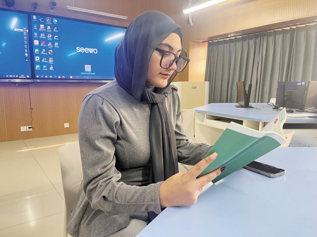 在湖北師范大學(xué)國際教育學(xué)院的一間教室里,陽光透過窗戶灑在書桌上。17歲的阿爾及利亞留學(xué)生劉心冉(Lydia)正在專注地閱讀一本《實用漢語教程》。